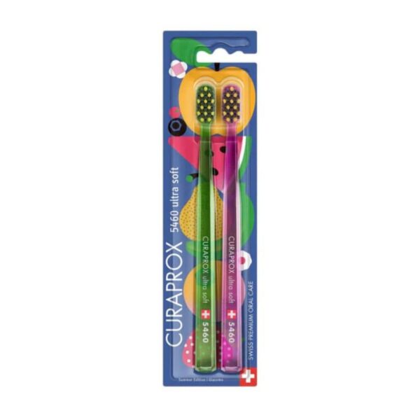 Elevate your oral care routine this summer with our Limited Edition Curaprox CS 5460 toothbrush set! These ultra-soft toothbrushes feature a summer-inspired design by renowned Italian artist Giacomo Bagnara. The transparent handle reflects the crystal-clear shimmer of a pool, while the vibrant brush head mirrors the bright colors and textures of freshly picked summer fruits.