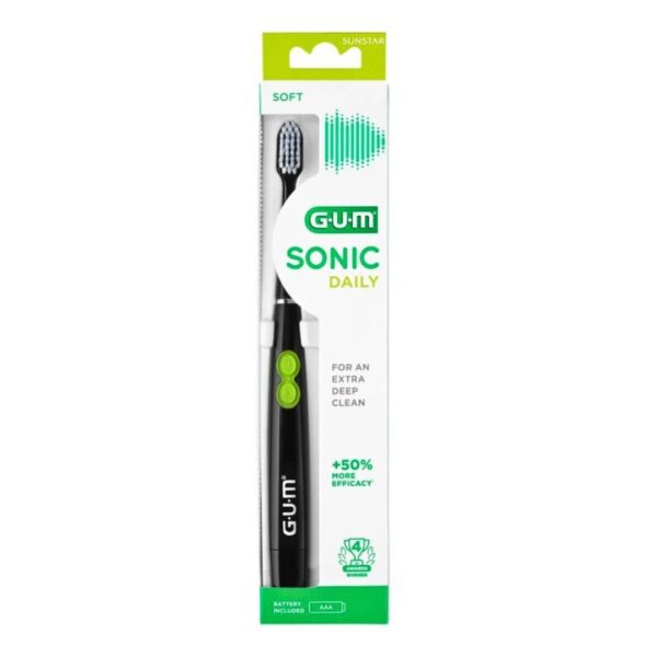 Let your patients feel the difference with our award-winning[1] GUM SONIC DAILY battery toothbrush, designed for the superior clean[2] of healthy teeth and gums. Its sonic vibrations move bristles from side to side to remove more plaque. This brush also features a special head with soft, bi-level bristles than thin out at one end, offering 50% more efficacy in cleaning interproximal areas and removing 47x more plaque from subgingival areas versus a manual flat trim toothbrush. Patients are able to effectively brush where they might otherwise find it difficult interproximal and subgingival areas helping to keep their gums and teeth plaque-free. The vibrating head also massages gums.