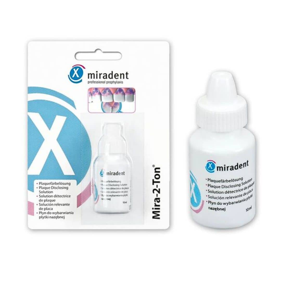 Жидкость показывает старый налёт тёмно-синим, а новый налёт розово-красным цветом. Mira 2-Ton легко удаляется обычной чисткой зубов. Не содержит эритрозина. Наносить жидкость на зубы с помощью ватной палочки или аппликатора с наконечником.