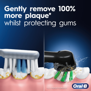 REMOVES UP TO 100% MORE PLAQUE AND UP TO 4 TIMES MORE PLAQUE FROM THE GUM LINE COMPARED TO A MANUAL TOOTHBRUSH.