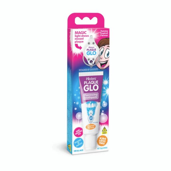 Piksters Plaque GLO Plaque Control Toothpaste marks out areas of plaque during brushing and highlights areas where brushing and flossing are most needed.