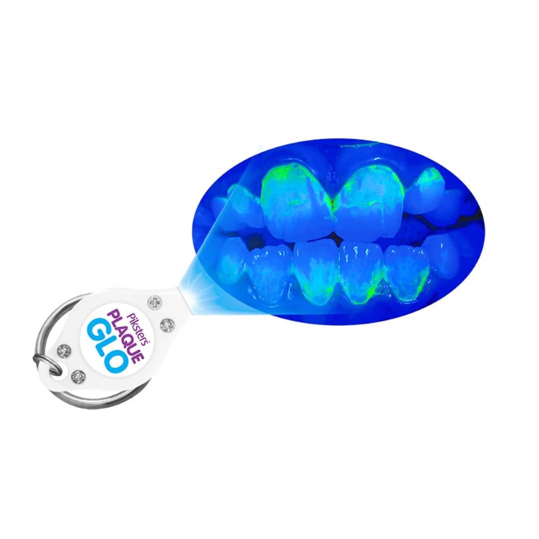 Детский набор PIKSTERS PlaqueGLO KIDS показывает участки, где зубы недостаточно очищены и где остается зубной налет. Они видны с помощью синего фонарика.
